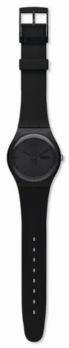 Plastic case with a black rubber strap. Fixed black bezel. Black dial with black steel hands and stick hour markers. Day and date display appears at the 3 o'clock position. Quartz movement. Scratch resistant mineral crystal. Solid case back. Case diameter: 41 mm. Tang clasp. Water resistant at 30 meters/ 100 feet. Functions: hours, minutes, seconds, calendar. Swatch Black Rebel Mens Watch SUOB702.